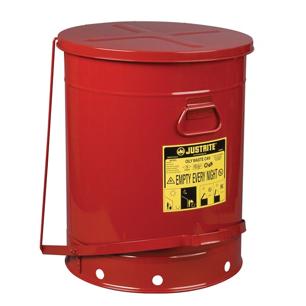 Oily Waste Can, 21 gal, 467 OD x 595 mm H, Red, Steel, Foot-operated Cover, Fill/Pour Hole, Round, Dispose of Oil-soaked Rags, Prevent Fires Caused by Stray Sparks or Spontaneous Combustion