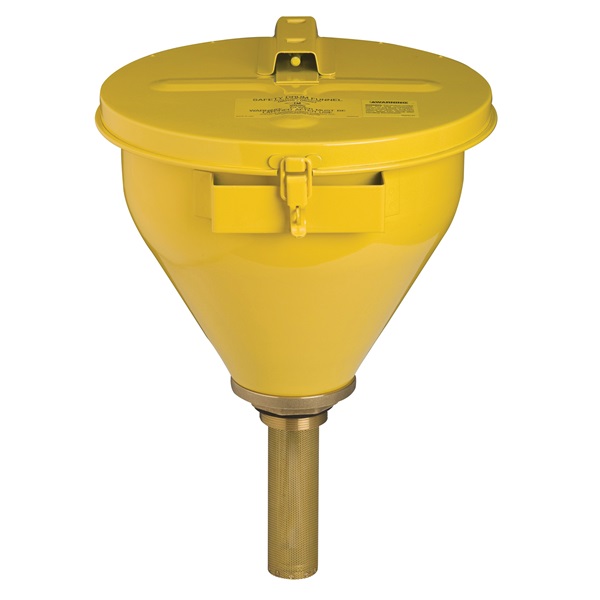 Drum Funnel, 9.8 L, Large, 10.75 dia x 10" H, Yellow, 3.6 kg, Galvanized Steel, 6" Brass Flame Arrestor, Self-Closing Cover, 2" Bung, 0.75" NPS/NPT, For Flammables