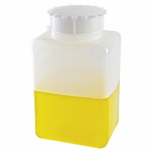Bottle, 1000 ml, 176 H x 103 W x 80 mm D, 58 mm ID, Clear, HDPE, Square, Wide Mouth, 100 ml Graduations, 110°C Temperature, Polypropylene Screw Closure, Polyethylene Liner, For Long Term Storage of Samples, Suitable for Foodstuff