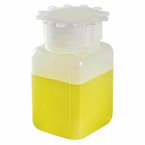 Bottle, 50 ml, 70 H x 38 W x 38 mm D, 24 mm ID, Clear, HDPE, Square, Wide Mouth, 10 ml Graduations, 110°C Temperature, Polypropylene Screw Closure, Polyethylene Liner, For Long Term Storage of Samples, Suitable for Foodstuff