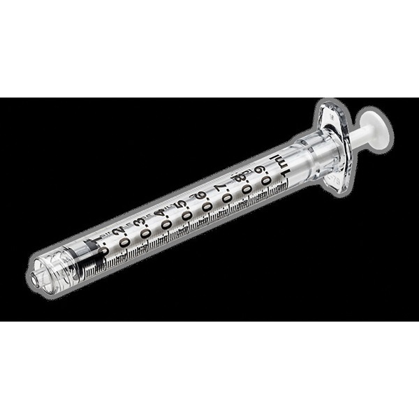 Tuberculin Syringe, 1 ml, Clear Barrel, Black Markings, White Plunger, Polycarbonate, Luer Lock Tip, Flat Top Style, 0.01 ml Graduation, Sterile, Disposable, Single Use Only, Concentric Tip Orientation