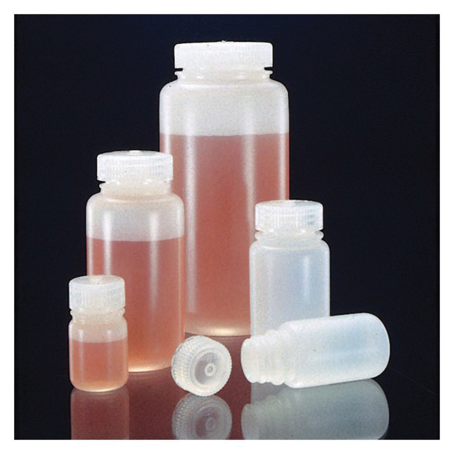 Perform short-term general purpose laboratory and field applications with Thermo Scientific™ Nalgene™ wide-mouth HDPE economy bottles with closure. These light-duty translucent bottles are a lightweight version of the original Nalgene™ bottle, bulk-packed for ultimate economy. Thinner-walled and more flexible than the Nalgene™ Lab Quality Bottles, they feature a wide mouth for easy filling and offer excellent chemical resistance to most acids, bases and alcohols.
