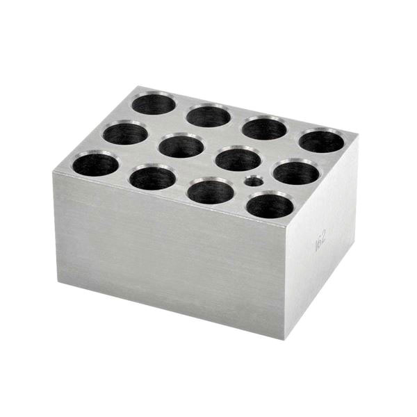 Standard Test Tube Block, 9.5 L x 7.6 W x 5.1 cm H, Anodized Aluminum, 12 Wells, 0.93 mm Sample, 17.5 dia x 48.4 mm D Well, Thermometer Well, Close Contact of Tubes-to-Walls Allowing For Maximum Heat Retention, Single Block