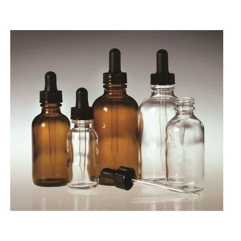 Round dropper bottles are supplied with attached glass dropper assemblies. Dropper bottles are ideal for dispensing small amounts of liquid. Choose clear glass for maximum visibility or amber glass for UV protection for light sensitive products. Our round dropper bottles feature attached dropper assemblies with black polypropylene closures, rubber bulbs and straight point glass dropper tubes. The opening of tube tip has a 3 mm outside diameter.