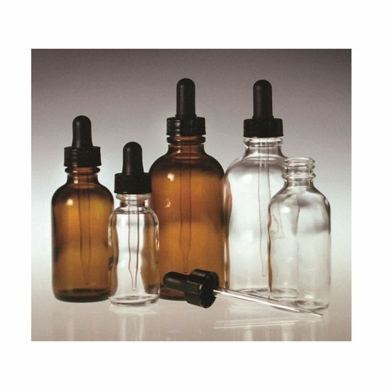 Round dropper bottles are supplied with attached glass dropper assemblies. Dropper bottles are ideal for dispensing small amounts of liquid. Choose clear glass for maximum visibility or amber glass for UV protection for light sensitive products. Our round dropper bottles feature attached dropper assemblies with black polypropylene closures, rubber bulbs and straight point glass dropper tubes. The opening of tube tip has a 3 mm outside diameter.