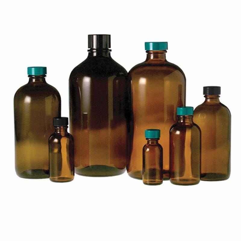 Bottle, 500 ml, 76 OD x 196 mm H, Amber, Glass, 38-439 Neck Finish, With Black Phenolic Closure, F217 & PTFE Liner, Boston Round, Vacuum & Ionized Treatment, Protect Contents from UV Rays