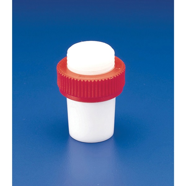 Safe-Lab™ solid PTFE plastic stopper with threaded polypropylene extracting nut is easily removed by turning the red extraction nut to apply a safe, gentle and even force against the mouth of the vessel.