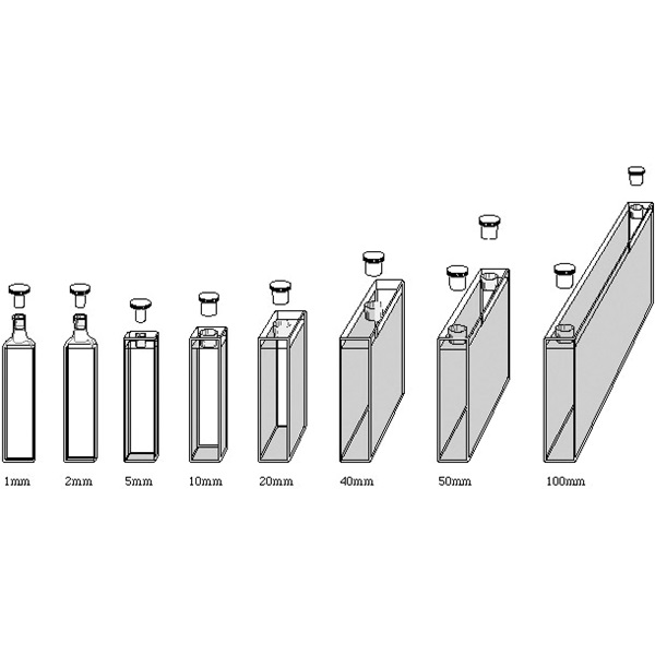 Spectrophotometer Cell, 1 mm Path Length, 3.5 L x 12.5 W x 55 mm H Exterior, 1 L x 10 mm W Interior, Quartz, Rectangular, 0.4 ml Nominal Volume, 2 Polished Windows, 170 to 2700 nm Range