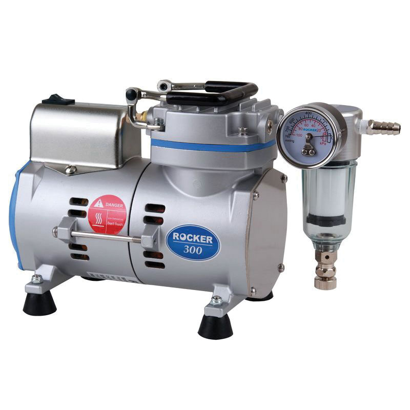 Vacuum Pump, Rocker 300 Model, 20 lpm Flow Rate, 220 V, 50 Hz Electrical Requirements, 1/8 Hp Horsepower, 50 dB Noise, 5/16" Hose Barb, 26.8 in Mecury Maximum Vacuum, For Filtration for Microbiology Test, Air Sampling, Vacuum Filtration