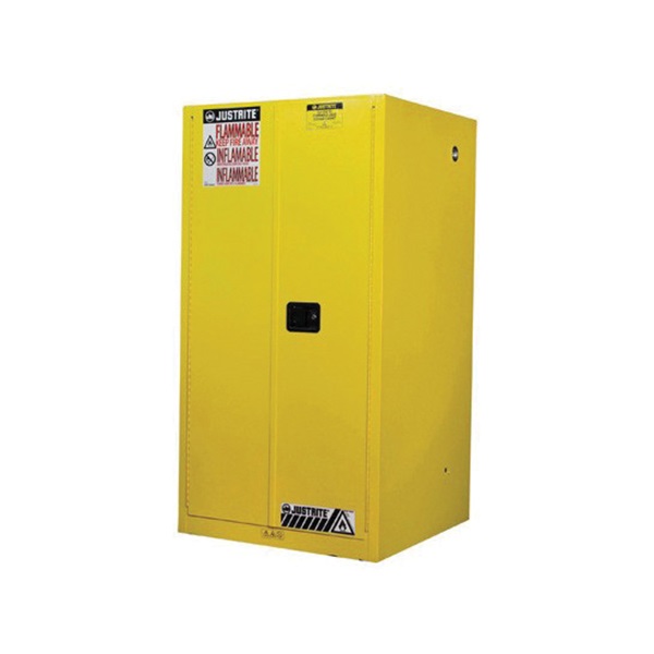 Protect workers, reduce fire risks, and improve productivity by storing flammable fuels and chemicals in code-compliant safety cabinets. Designed to meet OSHA and NFPA standards, Sure-Grip® EX cabinets are constructed of sturdy 18-gauge (1-mm) thick double-wall, welded steel with 1.5" (38-mm) of insulating air space for fire resistance. High-performance, self-latching doors close easily and securely for maximum protection under fire conditions. Fail-safe closing mechanism ensures three-point stainless steel bullet latching system works every time. For added security, U-Loc™ handle comes with a cylinder lock and key set or accepts an optional padlock. Haz-Alert™ reflective warning labels are highly visible under fire conditions or during power outages when illuminated with a flashlight. Patented SpillSlope® galvanized steel shelves direct spills to back and bottom of a leakproof 2" (51-mm) bottom sump. They adjust on 3" (76-mm) centers for versatile storage. Cabinets also feature dual vents with flame arresters, four adjustable self-leveling feet, grounding connector, and trilingual warning label. Durable lead-free epoxy/polyester powder-coat finish provides excellent chemical resistance. Manual-close door(s) opens to a full 180 degrees and self-latches when pushed closed. Self-close door(s) shuts and latches automatically when a fusible link melts at 165°F (74°C) under fire conditions. Unique, concealed self-closing mechanism offers obstruction-free access to contents. All door styles meet OSHA and NFPA 30; self-close door styles also meet NFPA 1 and the International Fire Code. Most cabinets are FM approved and all come with a ten-year warranty.