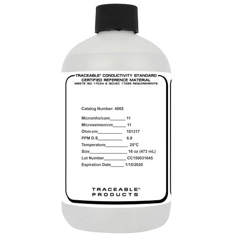 Highest accuracy available assuring reliable results - use standards with all meters - Traceable® conductivity standards are the most accurate available. Accuracy at 25°C is (±0.25 µS for 1, 5, 10 µS solution or ±0.25% for other solutions) or the uncertainty shown on the certificate, whichever is greater. Each bottle is labeled for calibrating conductivity (micro Siemens/micromhos), resistivity (ohms), and dissolved solids (parts per million). Methods supported This certified reference material meets test requirements for Federal, State, and local agencies, CAP, ASTM, NCCLS, CLSI, ACS, CLIA, AOAC, EPA, APHA, AWWA, WEF, USGS, USP, and ISO. Traceable® Certified Reference Material complies with and is essential for use in these official methods: AOAC 973.40, EPA 120.1, Standard Method 2510 (APHA, AWWA, WEF), ISO 7888, DIN 38404, ASTM D1125, USGS I-1780, USP 645, and for A2LA/NVLAP accreditations/ISO 9000 certifications. Material may be used to calibrate all conductivity meters and to determine all conductivity cell constants. A2LA accreditation ISO 17034 (1750.02) (formerly ISO guide 34) To assure accuracy an individually serial-numbered Traceable® Certificate is supplied to indicate traceability to standards provided by NIST (National Institute of Standards and Technology) and/or a National Standards Laboratory. A2LA accredited certification provides the highest achievable level of quality assurance, documentation, and accuracy. Certified Reference Materials are produced in an A2LA accredited ISO/IEC 17025:2005 (1750.01) calibration laboratory and from an A2LA accredited ISO 17034 (1750.02) (formerly ISO Guide 34) reference material producer. Additional certifications include ISO 31 (certificate content) and ISO 35 (statistical analysis), plus ISO 9001 (certified quality manufacturer). Supplied with Each bottle is supplied with step-by-step calibration instructions, individual temperature compensation chart, traceability information, and Traceable® Certificate.