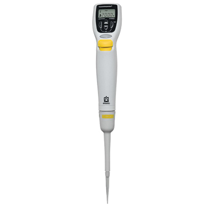 Pipette, 10 to 200 µl, Yellow Color Code, Single Channel, 0.2 µl Subdivision, =±0.8%, 1.6 µl Accuracy, =0.2%, 0.4 µl Coefficient of Variation, Clear LCD Display, Ergonomic, Adjustable Finger, Rechargeable NiMH Battery, Autoclavable