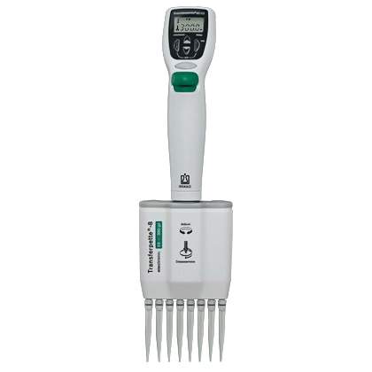The brand Transferpette® electronic single and multi-channel pipettes combine the innovation of the Transferpette® with the convenience and automation of motorized, electronic pipettes. The result is an accurate, ergonomic instrument for use in most laboratory applications. Both single and multi-channel models are available in five volume ranges, and feature an autoclavable pipette shaft or manifold, respectively.