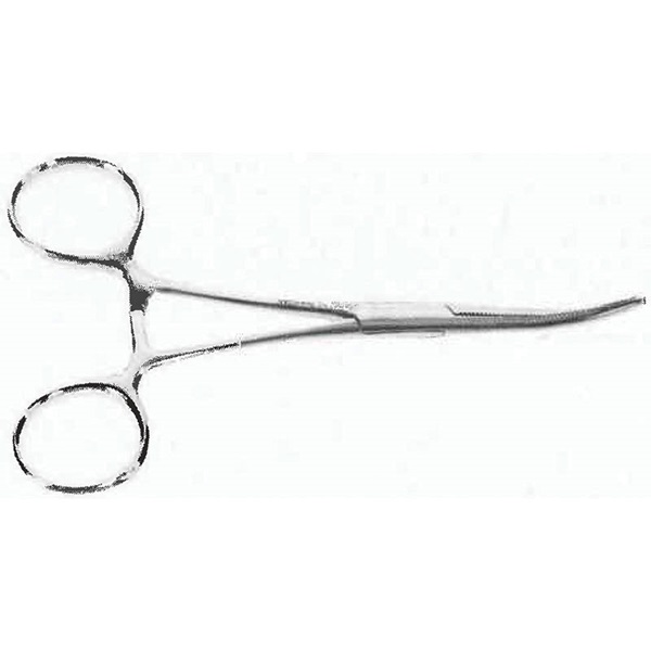 Stainless steel hemostatic forceps with box lock joints, serrated jaws and 1 x 2 teeth.