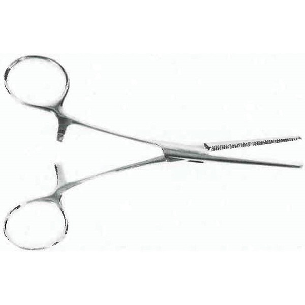 Stainless steel hemostatic forceps with box lock joints, serrated jaws and 1 x 2 teeth.
