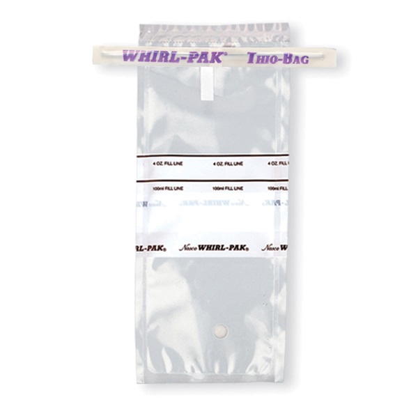 Specially designed for sampling chlorinated water, the Whirl-Pak® Thio-Bag® is economical and convenient to use. This single use, sterilized, lightweight, unbreakable container is always ready for immediate use. It will save...Technician Time, Replacing Sample Containers, Utility Costs, Storage Space, Disposal Costs, Used by many states and EPA approved, this strong transparent bag holds a nontoxic, nonnutritive tablet containing 10 mg of active sodium thiosulfate to neutralize chlorine at the time of collection. These markings help the technician collect the correct amount of water as required by the testing procedure (fill lines are approximate). The Write-on strip will accept virtually any writing instrument and minimizes ink smearing on the surface. A box of 100 bags takes up considerably less space than a box of 100 sample bottles. The 4-oz. (118 ml) size bags are packaged 25 in a sealed bag, four bags per box, for easy use. Capacity is measured in fluid ounces when the bag is closed and tab is folded over three times. Volume and dimensions are approximate, bags should not be used at temperatures above 180°F (82°C). Bags can be frozen to any temperature, even liquid nitrogen temperatures down to -346°F (-210°C) - careful handling required after freezing. All bags are sterilized after manufacturing.
