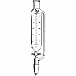 Cylindrical funnel has pressure equalizing sidearm; outer joint at top is same size as lower inner joint and graduated with a double scale from the PTFE stopcock.