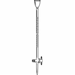 With funnel top shaped so that a rubber stopper carrying a short length of glass tubing can be inserted, when it is desired to fill the buret from a delivery tip by suction. With durable colored scale. Both sizes have 2 mm stopcock with PTFE plug. Top is funnel shaped to accommodate a rubber stopper and glass tubing to fill buret from a delivery tip via suction.