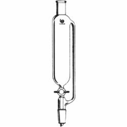 Cylindrical funnel has pressure equalizing sidearm and includes PTFE plug. Outer joint at top is the same size as the lower inner joint. Inner joint has a sealed-in drip tube.