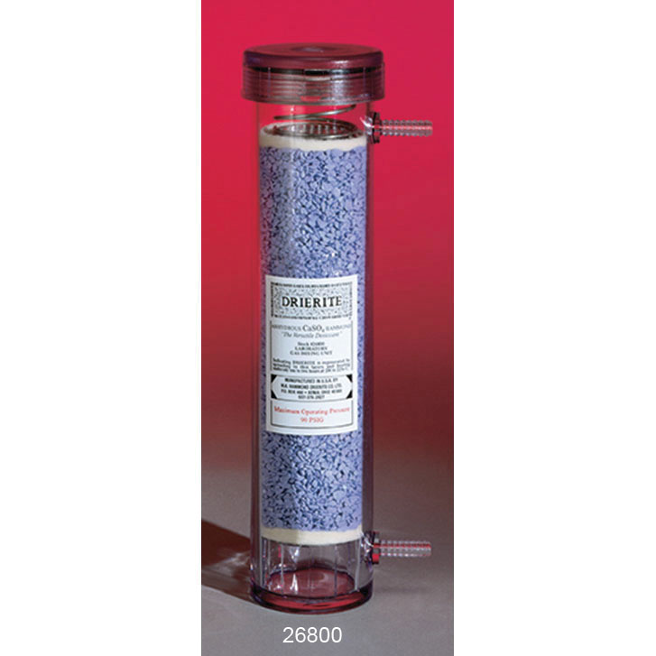 The Drierite™ laboratory air and gas drying unit is an all-purpose drier. This unit is suitable for most laboratory applications. It will dry air to a dew point of -100° F at atmospheric pressure or pressures up to 90 psig. A simple connection by rubber hose to the bottom inlet of the dryer provides an immediate flow of dry air or gas. This unit is also available with 0.125" SS NPT fittings (Stock Number 26840). Plastic coated mounting clips may be purchased separately. Continuous flows are possible with two units in the line and the necessary valves so that the exhausted column may be refilled while the alternate column remains in use. The Indicating Drierite™ gives constant visual assurance of active desiccant. When active, Indicating Drierite™ is a distinct blue color. When exhausted, it turns pink. The zone between the two colors in the column may be a purple color and should be a sharp narrow band when the flow rate is at equilibrium. Regeneration will restore the drying capacity. The laboratory gas drying unit can be refilled with fresh Drierite™, or the Drierite™ granules can be removed from the column and regenerated. See regeneration of Drierite™ desiccants for details.