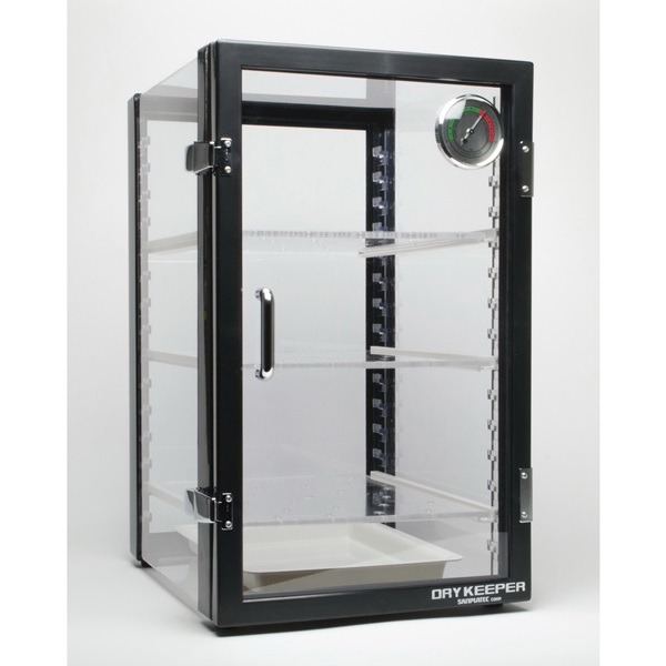 Desiccator Cabinet, 39 L x 31 W x 51 cm H, Translucent, PVC, Vertical, 2 cu ft Internal Volume, Holds 70 Cans, 3 Shelves, Hinged and Gasketed Door, Sleek Black ABS Accents, Vertical Profile, and Movable Shelves