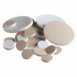 Septa, PTFE-Faced Silicone Rubber, 0.005" PTFE Thickness, 0.060" Silicon Rubber Thickness, 13 mm Thread Cap, For Open-top Caps, Highly Chemically Resistant, Resists Coring, Autoclavable
