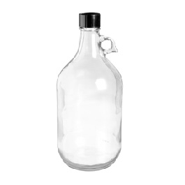 Bottle, 2500 ml, 135 dia x 295 mm H, Clear, Soda-Lime Glass, 38-439 Closure Size, Safety Coated, Black Phenolic Closure, Aluminum Foil Liner, Screw Thread, Jug Handle, Non-slip Coating, Plastisol Coating for Safety