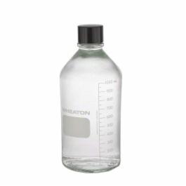 Media Bottle, 1000 ml, 103 dia x 235 mm H, Clear, Borosilicate Glass, Screw Thread, Black Phenolic Closure, 38-430 Closure Size, LDPE Closure Liner, Graduated, Special Pour Lip Facilitates Pouring, Chemical Resistance