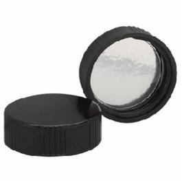Screw Cap, 38-439 Closure Size, Black, Phenolic, Solid Top Closure Style, Metal Foil Liner, Autoclavable, Aluminum Foil Faced Pulp Board Liner can be Used with Organic Solvents