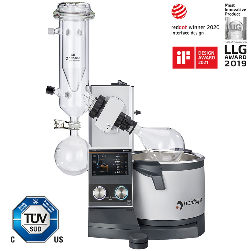 • Central operating panel with 5“ touch display • Clear display of all values (Basic and Advanced modes) • With timer, limitation of max. temperature, multilingual menu and text display for error messages • Separate knobs for rotation and heating with locking function to prevent accidental readjusting • LED ring lights and pictogram to display the activity even from a distance • Integrated solvent library to facilitate adjustment of the required vacuum on an external vacuum controller • USB and Micro SD interfaces • Optional display of vapor temperature • Subsequent upgrade to Hei-VAP Expert Control possible, including vacuum and chiller control