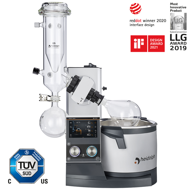 •Central operating panel with 5“ touch display•Clear display of all values (Basic and Advanced modes)•With timer, limitation of max. temperature, multilingual menu and text display for error messages•Separate knobs for rotation and heating with locking function to prevent accidental readjusting•LED ring lights and pictogram to display the activity even from a distance•Integrated solvent library to facilitate adjustment of the required vacuum on an external vacuum controller•USB and Micro SD interfaces•Optional display of vapor temperature•Subsequent upgrade to Hei-VAP Expert Control possible, including vacuum and chiller controlAdds numerous smart features to the Hei-VAP Expert, as well as an overview of all parameters and the current process•5" touch display for controlling the entire system including the vacuum and the cooling temperature•For precise monitoring, the pictogram on the display also symbolizes active functions•Separate knobs for quick access: the right one for direct vacuum control, the left one for the rotation•Setting of values either via the touch display or the separate quick access knobs•Direct access to two favorites on the start screen•Expandable solvent library. You can also transfer your own favorites to other devices using a USB stick•Define and save own evaporation processes (ramps)•Automatically evaporate with the Dynamic AUTOaccurate Program (DAA). Convenient and customizable: from foam avoidance to highly efficient evaporation•With USB and Micro SD interface for easy installation of software updates and transfer of individual favorites from one device to another