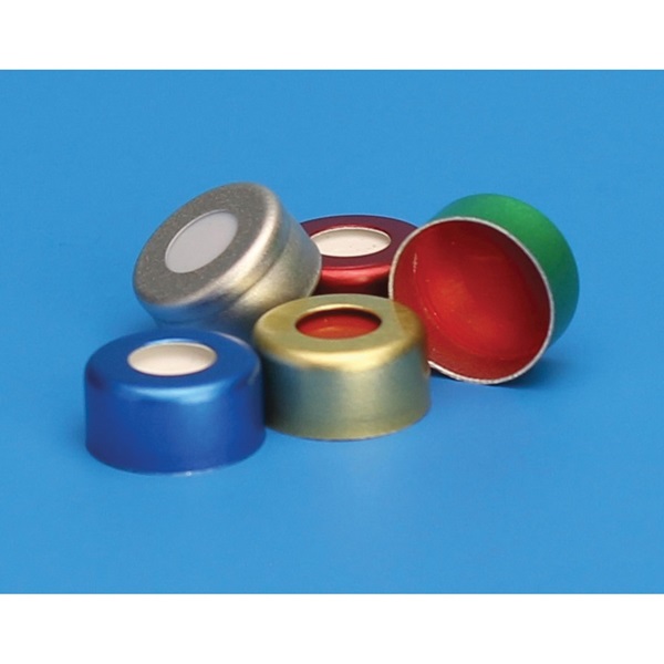 Made of the highest quality aluminum, for use with standard 11 mm chromatography vials. The open top allows for filling and retrieving samples with a syringe. Seals are available in a variety of colors for easy sample identification.