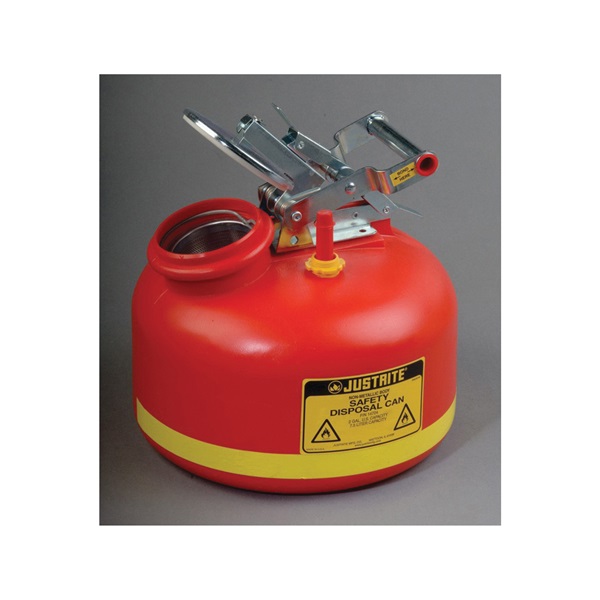 High-density polyethylene (HDPE) disposal cans provide superior chemical resistance and leak protection. Spring-loaded sealed cap, normally closed, automatically vents between 3 and 5 psig (0.2 and 0.35 bar). Stainless steel handle and hardware with latch-catch system hold the cap in the open position for easy filling and pouring. Large-mouth opening features a built-in stainless steel flame arrester to guard against outside ignition. The broad-base design provides stability and resists accidental tip over.