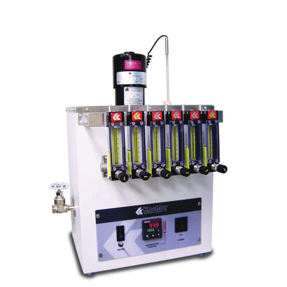 Constant temperature oil bath for testing oxidation stability of mineral insulating oils. Immerses six oil receptacles at the required depth per ASTM specifications at 110°C ±0.5°C, and controls oxygen flow to each sample at the rate of 1 L/hour ±0.1 L/hour through six independent flowmeters mounted on a common manifold. Insulated double-wall stainless-steel bath has microprocessor temperature control with °C/°F switchable digital setpoint and display. Operator and equipment are protected by an overtemperature control circuit which automatically interrupts power to the unit when bath temperature exceeds a programmed cut-off point.