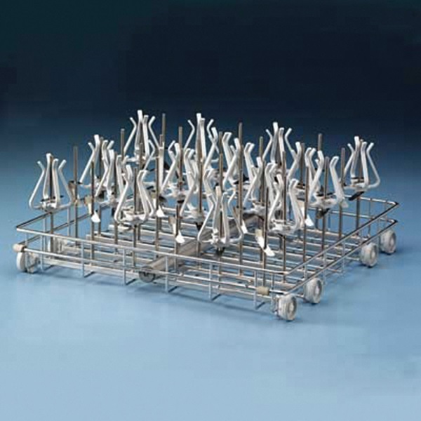 Lower spindle rack provides direct injection cleaning through the spindles. One is included with every FlaskScrubber and FlaskScrubber Vantage series glassware washer. May be used in place of the Lower Standard Rack in any SteamScrubber. Constructed of Type 304 stainless steel. Includes 36 removable spindles, 36 adjustable height clips, 10 small spindles, tool to remove spindles and 36 nylon plugs. Spindles may be removed and plugged to accommodate accessory inserts. Spindle dimensions: 7.4 high x 0.25" OD. Accommodates glassware up to 18.7" high (without upper rack in place) and 8.3 to 10.6" high (with upper rack in place, depending on rack position).