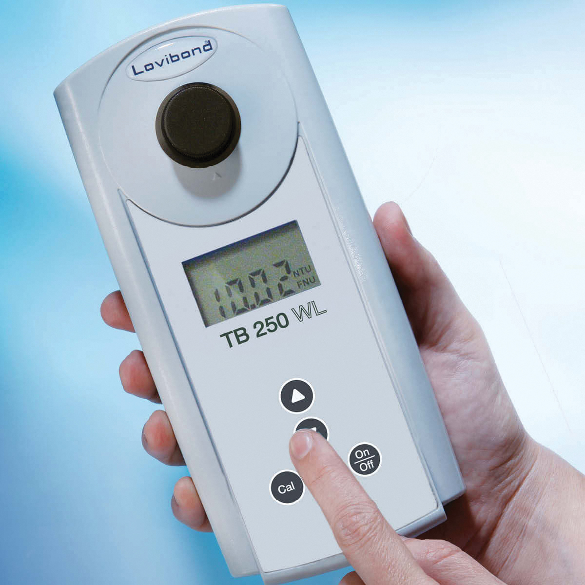 Turbidimeter, 95 x 45 x 210 mm, 0,01 bis 1100 NTU, Measuring Range, Large LCD Display, TB 250 WL Model, Portable, Round Cuvettes 24 mm Vial, 4 Batteries, Auto-off, 0 to 50 °C at 0 to 90% Relative Humidity, Nephelometric (90° Scattered Light)