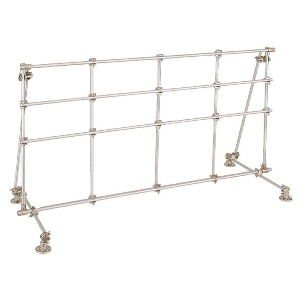Floor mounted, free-standing unit is specifically designed for heavy-duty work such as pilot plant set-ups. Outside frame is constructed of a strong, but lightweight steel channel. Interior lattice uses a horizontal channel connector; one end accommodates the rod, the other end fits into the channel and locks tightly with a bolt. Loosen the bolt, and the connector slides easily along the channel track for simple lattice adjustment. Entire apparatus is supported on sturdy, counter-weighted cast iron feet, which may be bolted to the floor for added stability required in top-heavy installations.