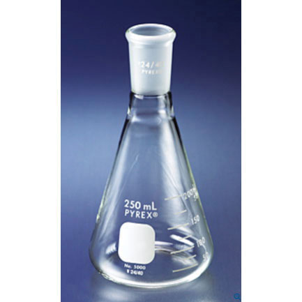 These narrow mouth 50 ml Pyrex® erlenmeyer flasks have 19/38 standard taper joints. Their uniform wall thickness provides the proper balance between mechanical strength and thermal shock resistance. For convenience, these flasks are graduated to show approximate capacity. An extra large marking space is also provided.
