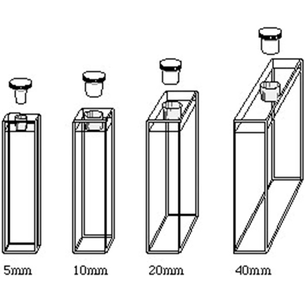 Type 23 cells are identical to standard rectangular fluorometer cells as listed on page 26 except that instead of having an open rectangular hole at the top, a block is fused to the top of the cell with a ground hole to receive a PTFE stopper. This provides a more suitable seal for volatile liquids. A PTFE stopper is supplied with each cell. Two stoppers are supplied with cells which have a path length of 40 mm or greater. Smaller volume Types 29F and 28F are identical to types 9F semi-micro and type 18F micro cell ranges except they have a stopper instead of a lid. A PTFE stopper is supplied with each cell.