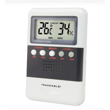 Digital relative humidity/temperature meter with minimum/maximum memory Unique instrument shows the exact air conditions in labs, hoods, clean rooms, coolers, stockrooms, incubators, environmental chambers, and chemical storage areas. Memories store min/max readings Continuously and simultaneously displays relative humidity and temperature in °F/°C with dual-recall memories. Monitors conditions overnight, on weekends, or for any time period. Temperature range is 32 to 122°F and 0 to 50°C with a resolution of 1° and accuracy of ±1°C. Humidity range is 25 to 95%, resolution is 1% RH, and accuracy is ±2% RH mid-range to ±4% RH elsewhere. Fast-response solid-state sensors show changes in less than 30 seconds. Display is updated once per second. Multi-point calibration on an individually-numbered Traceable® Certificate which assures accuracy from our ISO/IEC 17025:2005 (1750.01) calibration laboratory accredited by A2LA. It indicates traceability of measurements to the SI units through NIST or other recognized national measurement institutes (NMI) that are signatories to the CIPM mutual recognition agreement. Extra-large, easy-to-view 5/8' high digits can be read at a glance from as far away as 20'. Meets federal requirements for CLIA specification 493.1252 for monitoring temperature and humidity. Self-contained, stable, accurate unit requires no adjustment or maintenance. Case is chemical-and shock-resistant ABS plastic. Supplied with Traceable® certificate, wall mount, bench stand, switch to read °F/°C, fast-response solid-state sensors, and two AAA batteries. Size is 2.62 x 3.87 x 0.625" Weight is 2.5 oz. Replacement battery catalog number 1112.
