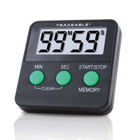 3-key operation makes this Traceable® timer incredibly easy to learn and use. Timer counts down from 99 min, 59 sec in second increments. Quartz-crystal timing accuracy is 0.01%. 19 mm digits are readable from 6 m. Alarm sounds for 30 sec and then silences automatically.