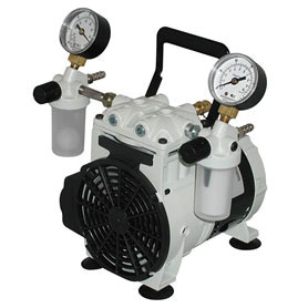 Reliable WOB-L piston pumps are perfect for many common laboratory vacuum applications. Features: Vacuum and pressure - to 60 Torr (27.6" Mecury). Includes vacuum and pressure regulators and gauges - simple to adjust and monitor vacuum level and delivery pressure. Inlet water trap - float ball rises to seal off pump from accidental ingestion of water. Muffler quiets pump and filters discharge air. For use with dry or aqueous vapor applications only.