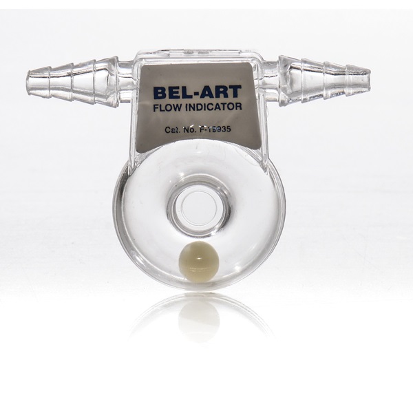 Flow Indicator, 76 x 57 mm Overall Size, Polycarbonate Housing, Nylon Indicator Ball, with Two 23 mm Long Tube Extension, Provides Immediate Visual Indication, Arrow Shows Direction of Flow, For 6.4 mm to 9.5 mm ID Tubing