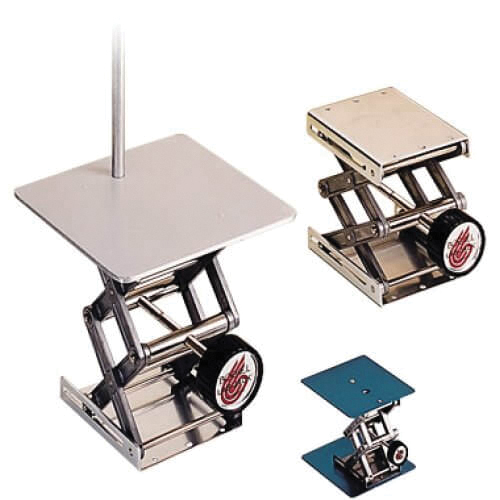 Lab Jack®, Micro, 4.5 kg Maximum Capacity, 2.54 to 8.26 cm Height Range, Stainless Steel Drive Screw, Anodized Aluminum Top and Bottom Plates, 7.62 x 7.62 cm Platform Size, Scissor Action, Knob Height Adjustment