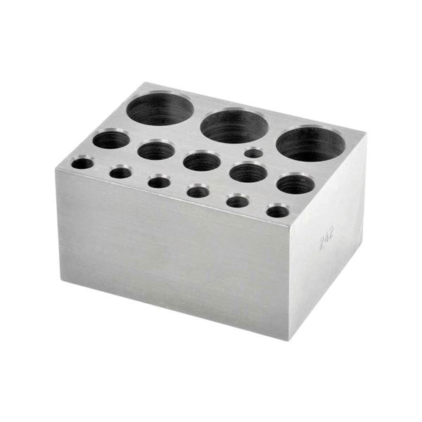 Centrifuge Tube Combination Block, 9.5 L x 7.6 W x 5.1 cm H, Anodized Aluminum, 14 Wells, 25 mm/0.92 mm/6 mm Sample, 8.3 mm/13.8 mm/26.2 mm Well Diameter, 48.4 mm Well Depth, Thermometer Well, Single Block