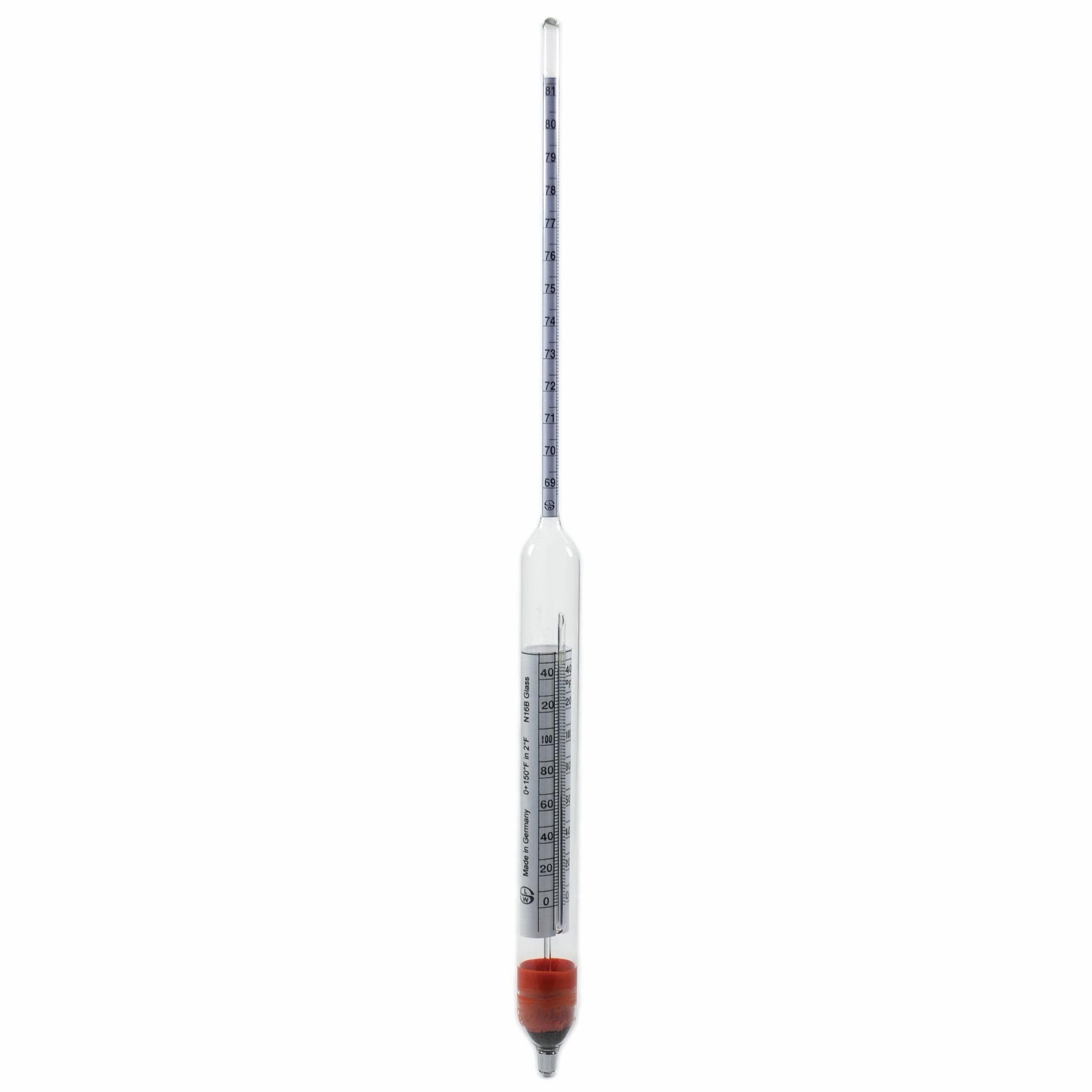 Precision Hydrometer, 380 mm L, ASTM Number 56HL, 49 to 61° API Range, Combined Form, Glass, 0.1° Division, 0/150°F Thermometer, with Spirit-Filled Thermometer, Suitable Thermal Properties for the Entire Temperature Range, Resists any Reactions from Chemical Agents